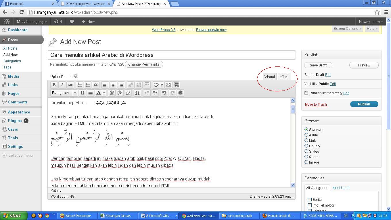 Untuk membuat tulisan arab dengan tampilan seperti diatas sebenarnya cukup mudah, cukup menambahkan beberapa baris kode pada menu HTML dengan klik pada tab HTML (yang dilingkari merah), seperti pada gambar berikut :